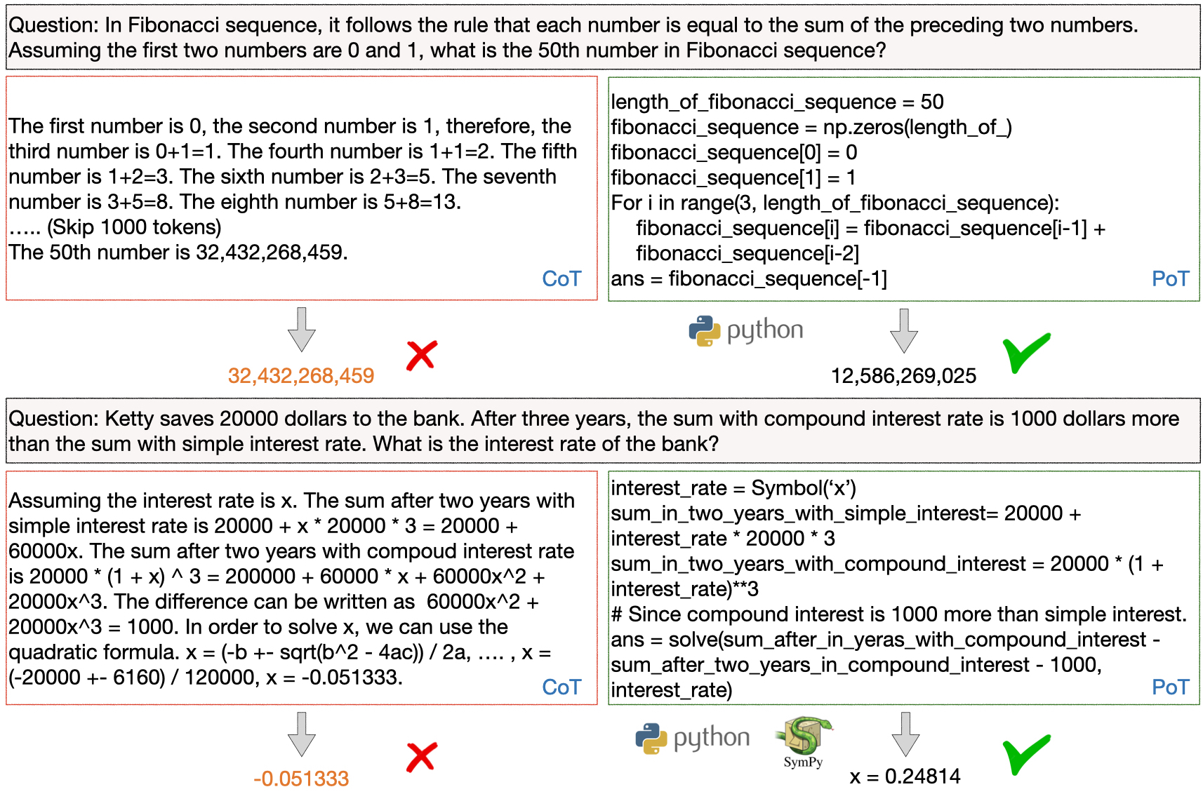 Program of Thought aims to leverage an external python interpreter in order to generate intermediate reasoning steps. This helps us to achieve a greater degree of performance in mathematical and programming-related tasks by grounding our final response in deterministic code.