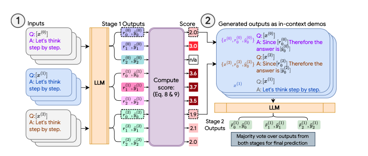 Consistency Based Self Adaptive Prompting (COSP)1 aims to improve LLM output quality by generating high quality few shot examples to be included in the final prompt. These are examples without labelled ground truth so they use self-consistency and a metric known as normalized entropy to select the best examples.